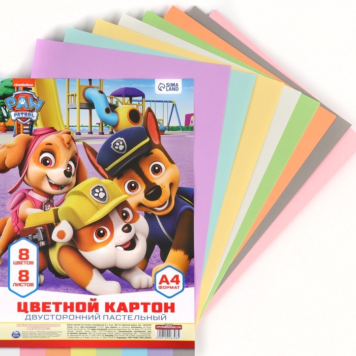 Картон цветной тонированный, А4, 8 листов, 8 цветов, немелованный, двусторонний, в пакете, 180 г/м², Щенячий патруль