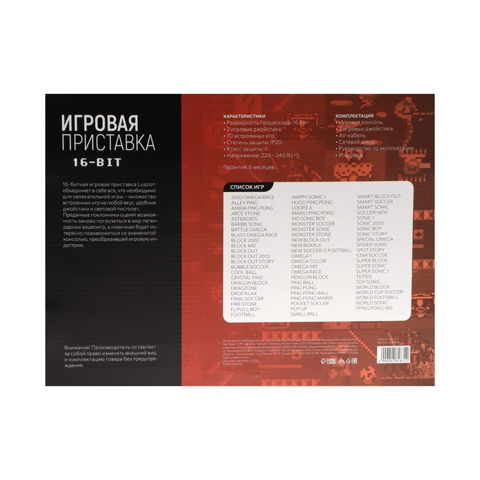 Игровая приставка Luazon Game-2, 16 бит, в комплекте два джойстика, 70 игр, чёрная