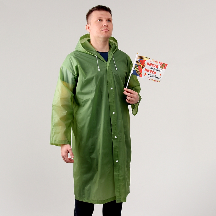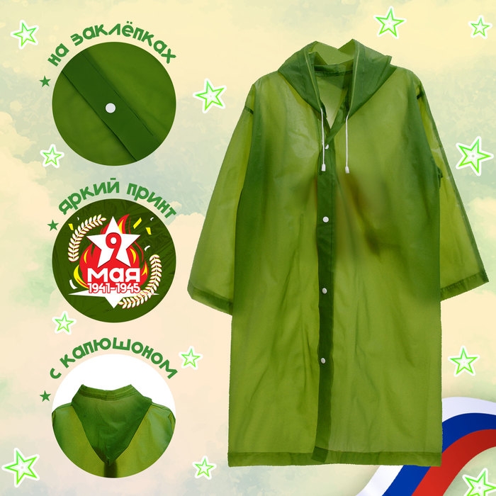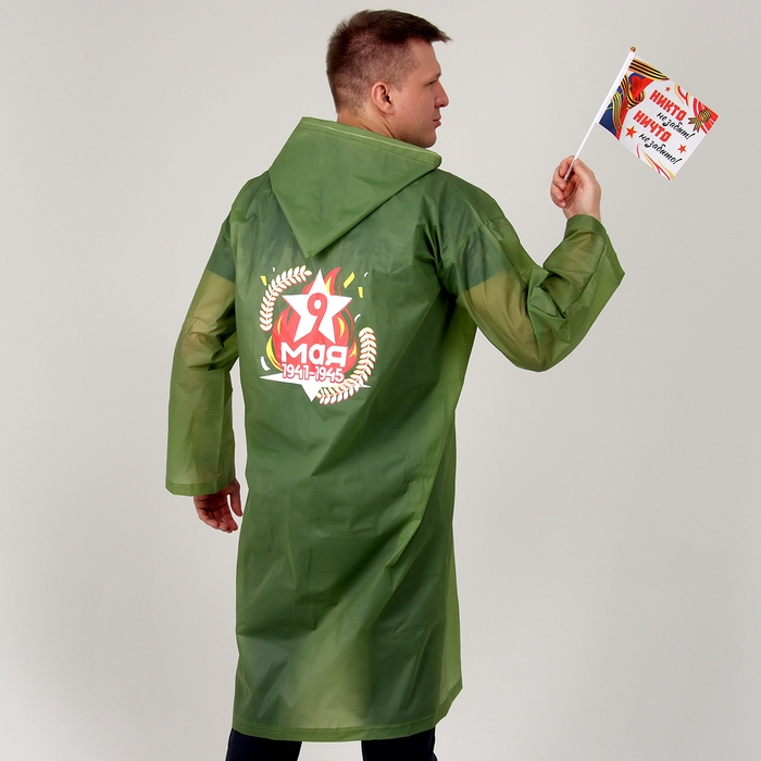 Этот набор будет уместен на различных мероприятиях, посвященных Дню Победы, таких как парады, митинги, шествия или просто праздничные прогулки. Дождевик защитит от непогоды, а флажок поможет выразить уважение и память о событиях, связанных с этим днем. Набор также можно использовать в качестве тематического аксессуара на карнавальных вечеринках или в образовательных мероприятиях, посвященных историческим событиям.