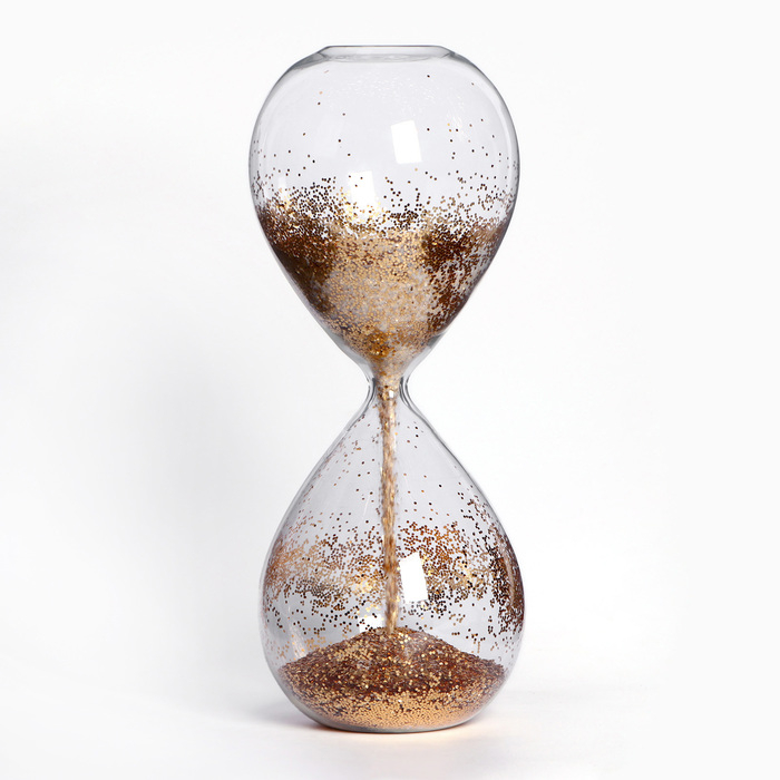 Необычные песочные часы – лучший способ декорировать интерьер комнаты или офиса. Изготовленные из стекла и декоративных золотых блёсток, эти часы подойдут под любой интерьер. Дизайн красивых интерьерных часов очаровывает. Глядя на движение разноцветных блёсток вы постепенно будете чувствовать как проходит ваша тревога и стресс. Стилизованные песочные часы состоят из двух сосудов, соединённых узкой горловиной, один из которых частично заполнен блёстками.
