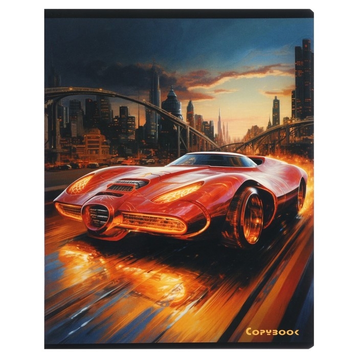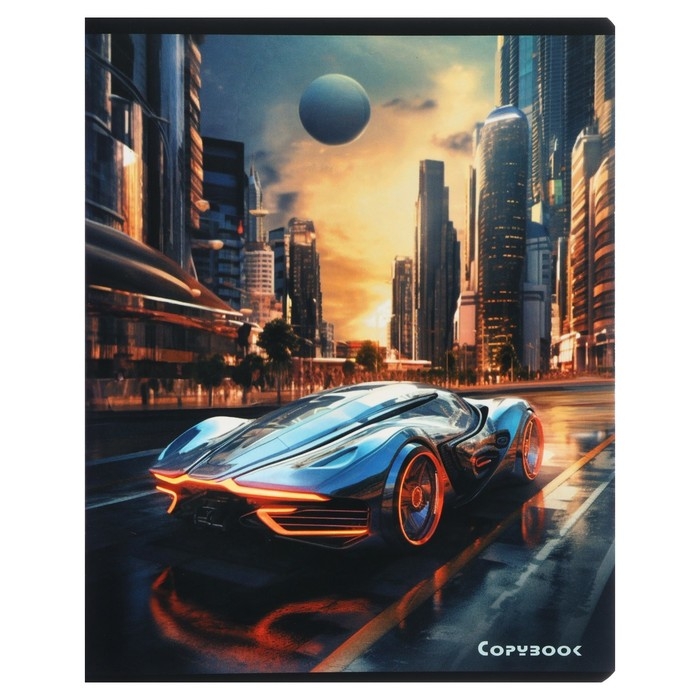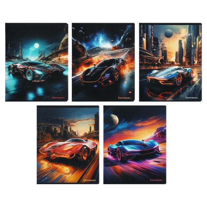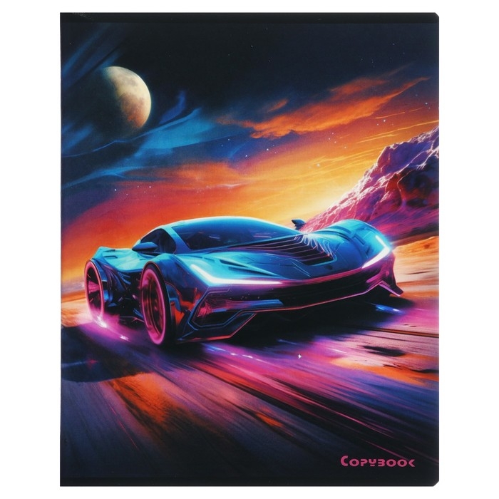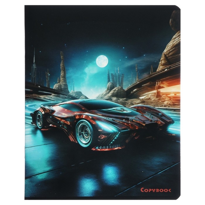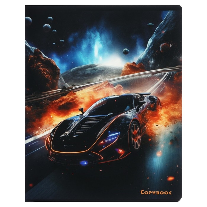 Тетрадь 48 листов в клетку на скрепке "Космические тачки", обложка мелованный картон, твин-лак, УФ-лак, блок офсет, МИКС