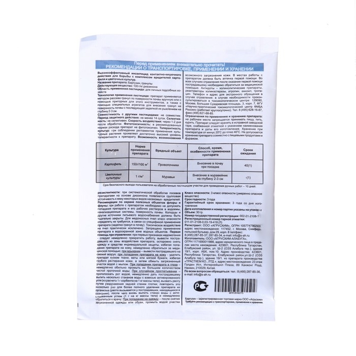 Баргузин — это гранулированный контактно-кишечный инсектицид широкого спектра. Он применяется в борьбе с вредителями–почвенниками: проволочниками, жужелицами, долгоносиками.Механизм действия: Препарат применяется путем внесения в почву гранул при посадке культуры и в период развития вредителей.После внесения в почву, действующее вещество препарата (диазинон) попадает в почвенный раствор, перераспределяется по площади участка и часть препарата проникает в защищаемое растение вместе с почвенной влагой.Попадая в организм вредителя (контактно через кутикулу или кишечно при поедании культуры) воздействует на нервную систему насекомого, в месте действия ингибирует фермент ацетилхолинэстеразу, через 2-3 часа резко снижается поедательная способность вредителей и теряется их двигательная активность.Полная гибель насекомых наступает через 1-3 дня после обработки.Пять преимуществ препарата:Эффективен против широкого спектра почвообитающих насекомых-вредителей, в том числе проходящих промежуточные стадии развития в почве.Незаменимый препарат для борьбы с проволочником и садовыми муравьями.Имеет высокую скорость воздействия (3-4 часа).Баргузин имеет довольно продолжительный период защитного действия (10-14 дней).Препарат имеет удобную в использовании препаративную форму, что позволяет четко дозировать необходимые нормы применения.