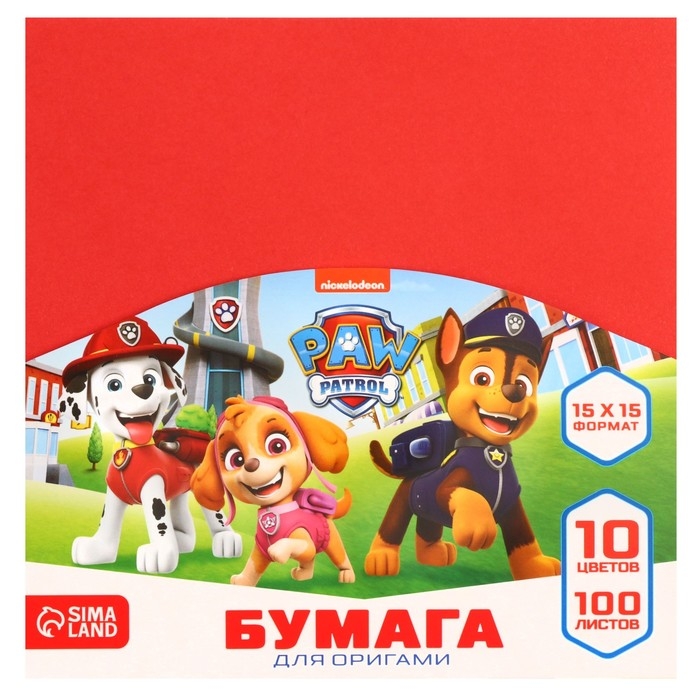 Бумага цветная для оригами, 15х15 см, 100 листов, 10 цветов, немелованная, двусторонняя, в пакете, 80 г/м², Щенячий патруль