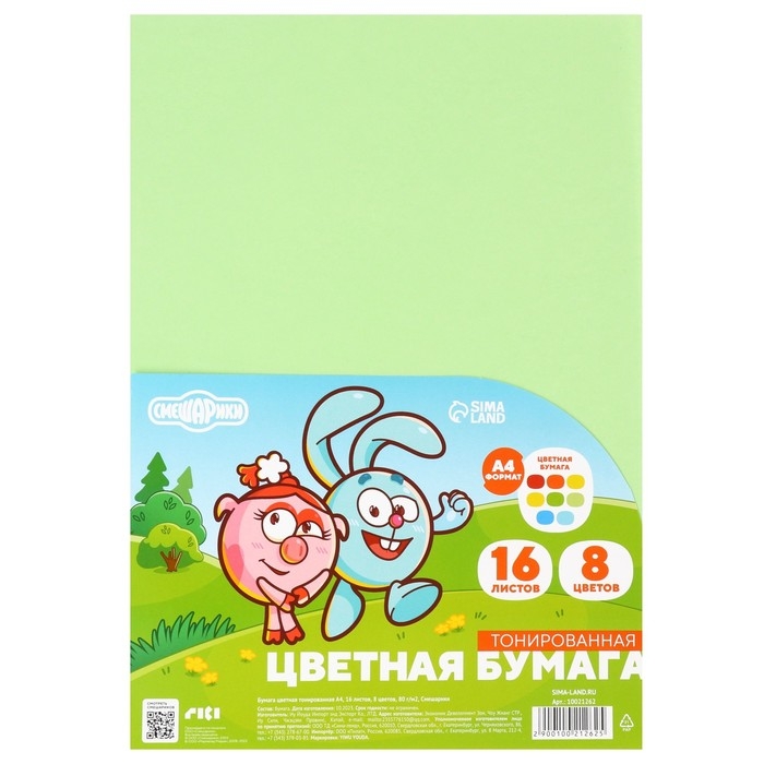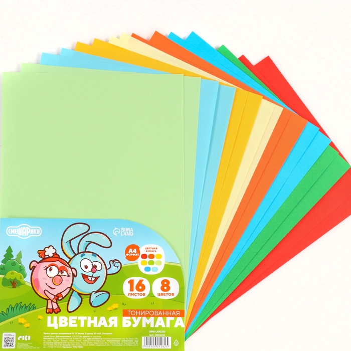 Бумага цветная тонированная, А4, 16 листов, 8 цветов, немелованная, двусторонняя, в пакете, 80 г/м², Смешарики