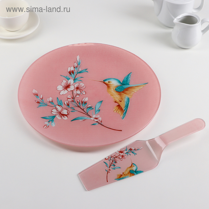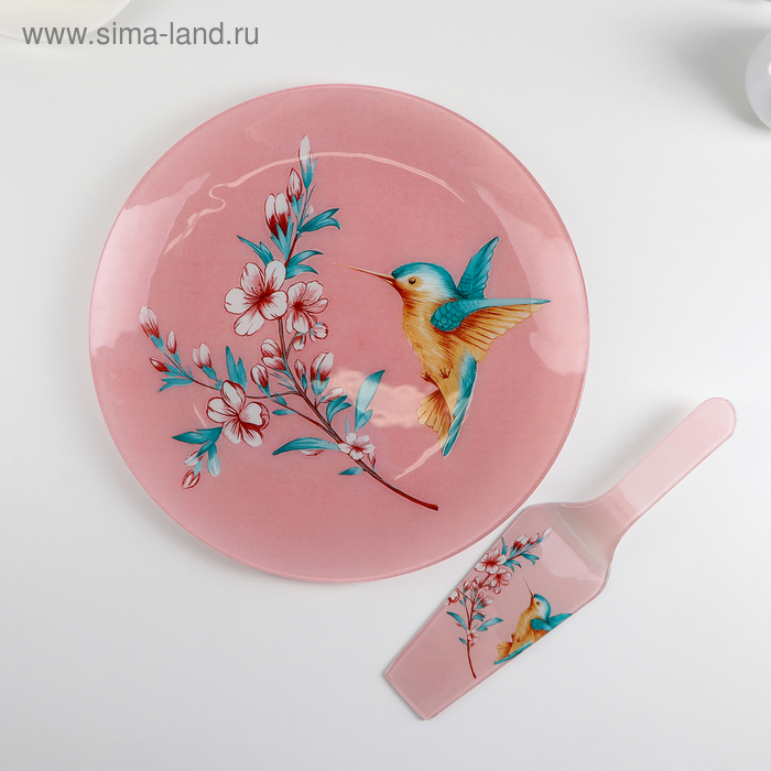 Тортовница стеклянная с лопаткой Доляна «Колибри», d=30 см, лопатка 26,5×7 см, цвет нежно-розовый