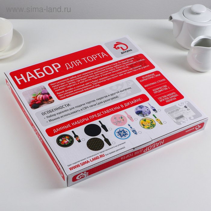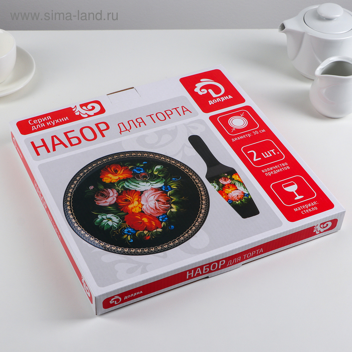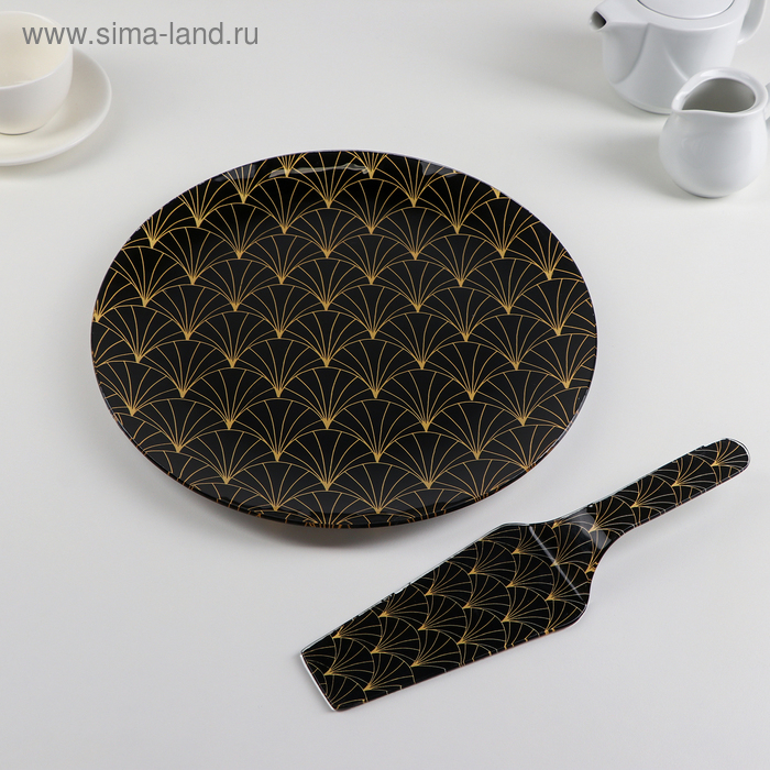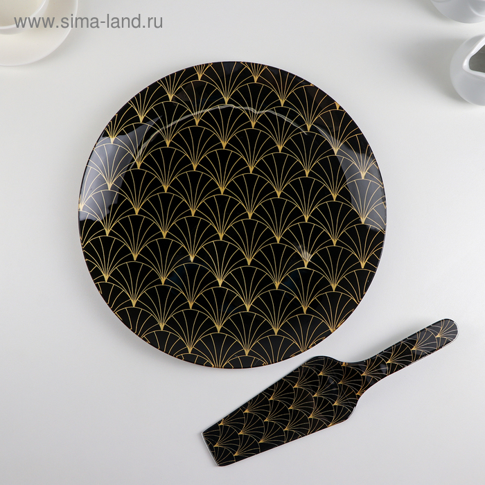 Тортовница стеклянная с лопаткой Доляна «Золотое перо», d=30 см, лопатка 26,5×7 см, цвет чёрный