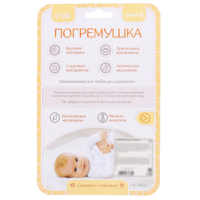 - При взаимодействии с игрушкой ребёнок услышит забавные звуки: внутри погремушки находится элемент с гремящими при движении шариками.