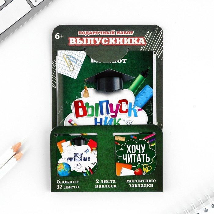Подарочный набор на выпускной: Блокнот А6, 32л, наклейки и магнитные закладки 2 шт «Выпускник»