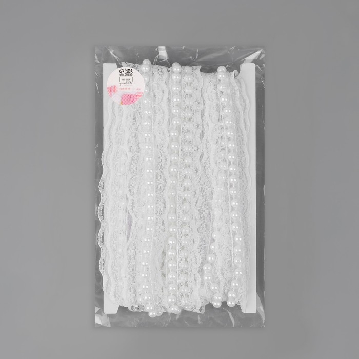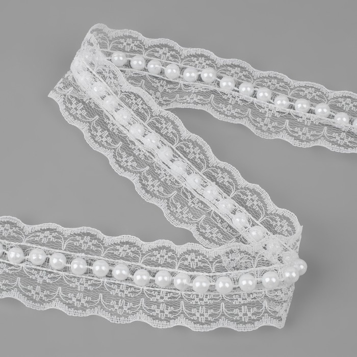 Рюш кружевной, с бусинами, 35 мм, 4,5 ± 0,5 м, цвет белый