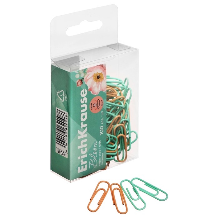 Скрепки канцелярские 28 мм, 100 штук, ErichKrause Pastel Bloom, цветные с виниловым покрытием, пластиковая коробка, МИКС