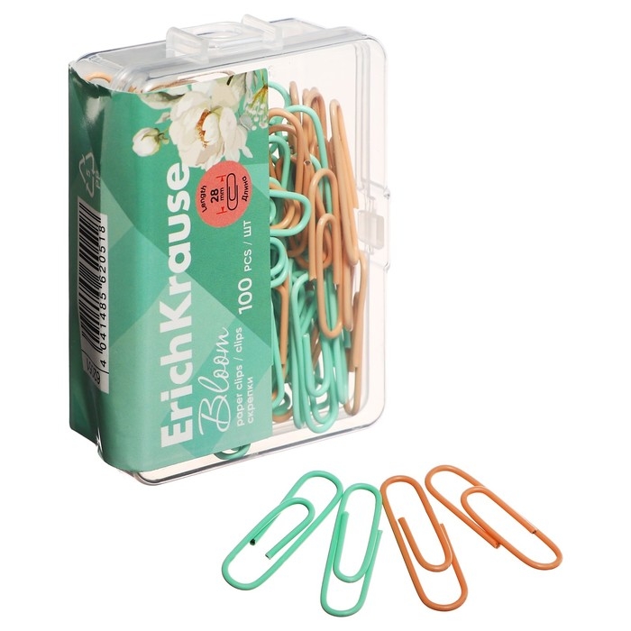 Скрепки канцелярские 28 мм, 100 штук, ErichKrause Pastel Bloom, цветные с виниловым покрытием, пластиковая коробка, МИКС