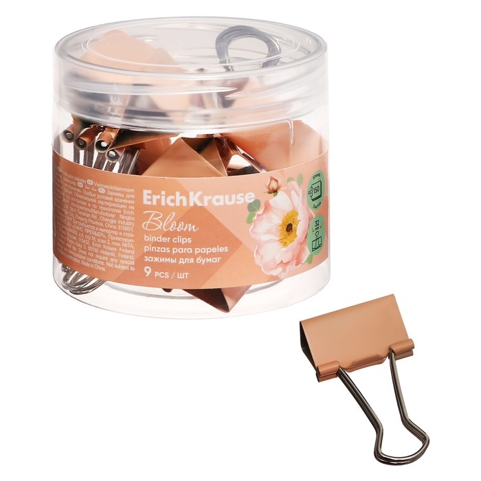Набор зажимов для бумаг ErichKrause "Pastel Bloom", 32 мм, 9 штук, персиковые, в пластиковой коробке