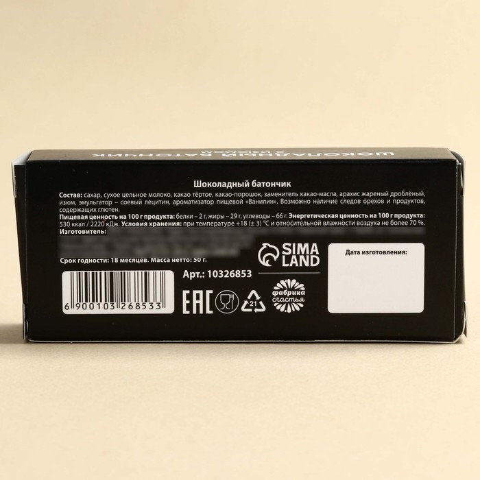 Батончик шоколадный «С днём рождения» с изюмом, 50 г.