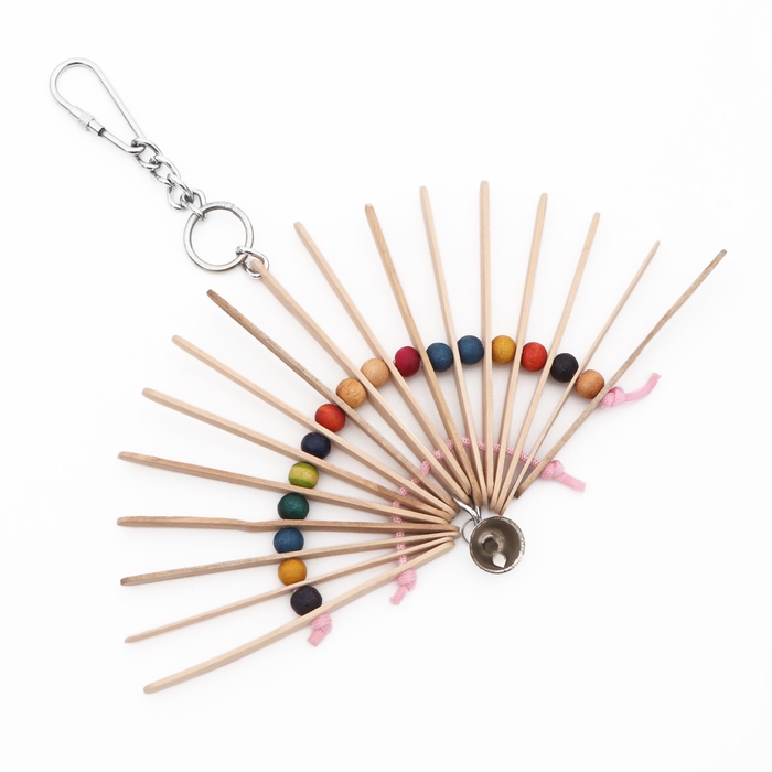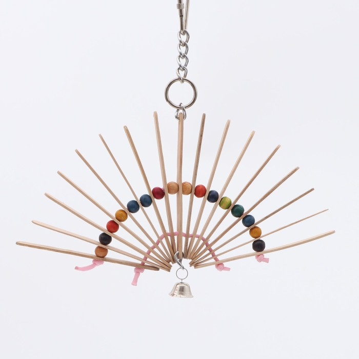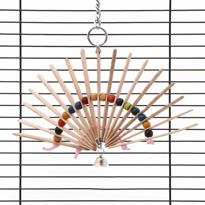 Игрушка состоит из веера, собранного из тонких деревянных пластин, и дополнена яркими бусинами. Вращаясь, веер привлекает внимание птицы, а звенящий колокольчик добавляет дополнительную стимуляцию. Такая конструкция идеально подходит для поддержания активности вашего питомца, что важно для его здоровья и хорошего настроения.