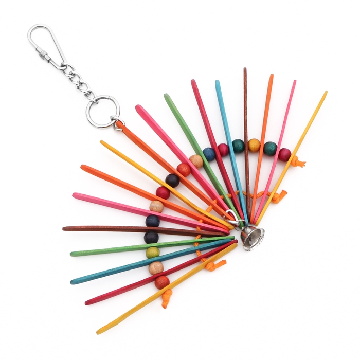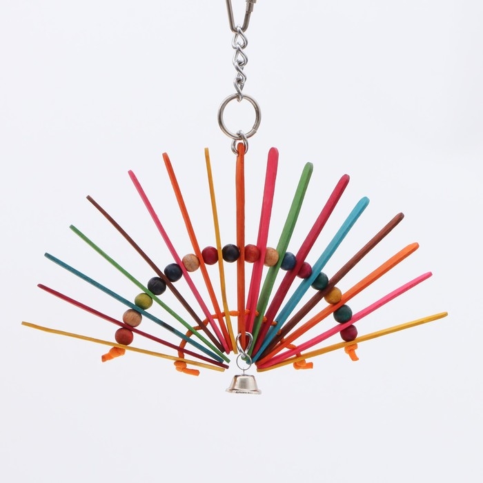 Веер изготовлен из натурального дерева и украшен яркими бусинами, которые придают изделию привлекательный внешний вид. При движении игрушка издаёт приятный звук благодаря встроенному колокольчику, что неизменно привлекает внимание птицы и стимулирует её к игре.