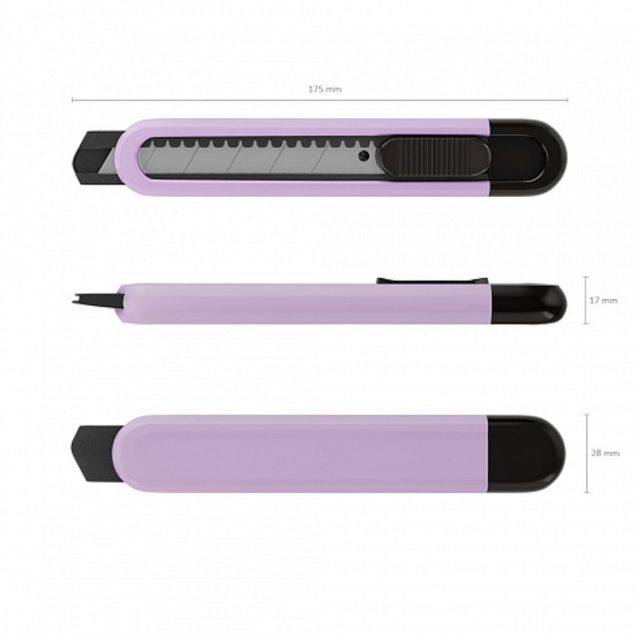 Нож канцелярский с автоматической системой фиксации лезвия auto-lock и насадкой для безопасного отделения сегмента лезвия. Корпус ножа изготовлен из легкого и прочного пластика. Наличие металлических направляющих. Комплектуется износостойким стальным лезвием с двухсторонней заточкой.