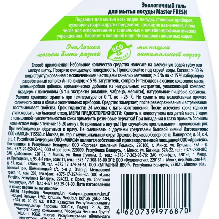 Средство для мытья посуды Master FRESH экологичное не содержит агрессивных химических веществ, поэтому оно безопасно для здоровья и окружающей среды. Оно также не вызывает аллергических реакций и подходит для использования людьми с чувствительной кожей.