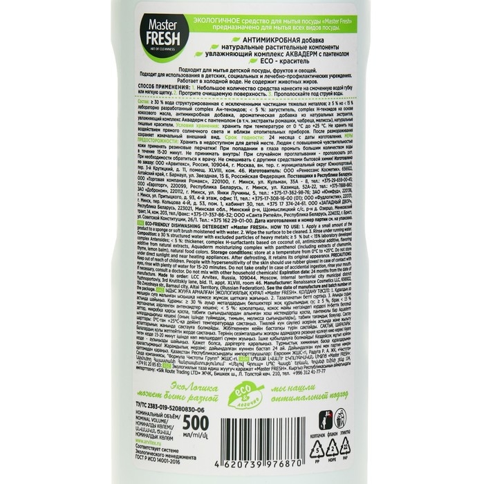 Средство для мытья посуды Master FRESH экологичное - это идеальное решение для тех, кто ценит чистоту и заботится о природе. Объем флакона составляет 500 мл, что делает его экономичным и удобным в использовании.