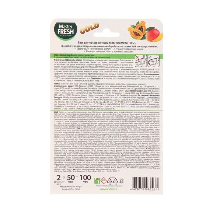 Блок для унитаза Master FRESH, DUO EFFECT 5в1 формула GOLD, тропик, 2 шт - это инновационное средство для поддержания чистоты и гигиены в ванной комнате. Он предназначен для использования на унитазах и других поверхностях, обеспечивая эффективное очищение и дезинфекцию. Блок содержит активные компоненты, которые удаляют пятна и загрязнения, а также уничтожают бактерии и вирусы. Он имеет приятный аромат тропических фруктов, который освежает воздух в ванной комнате.