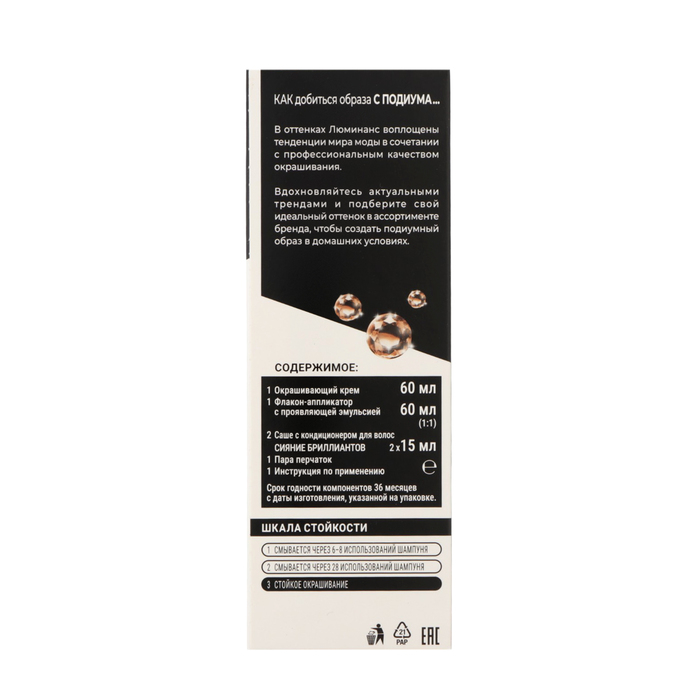 В оттенках стойкой краски для волос Люминанс воплощены последние тенденции мира моды и окрашивания в сочетании с профессиональным результатом. Формула с аммиаком и 2х-ступенчатой системой сияние бриллиантов позволяет добиться восхитительной яркости цвета до 10 недель и экстраблеска.