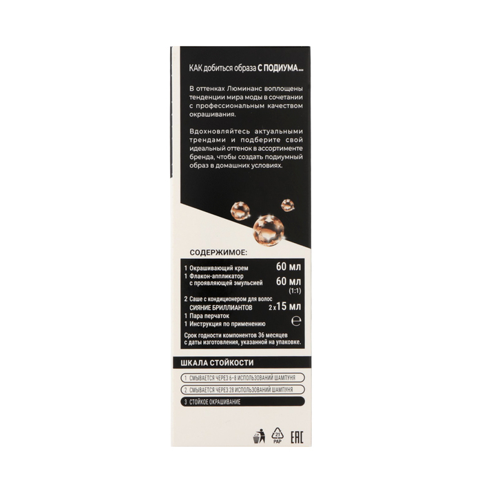 В оттенках стойкой краски для волос Люминанс воплощены последние тенденции мира моды и окрашивания в сочетании с профессиональным результатом. Формула с аммиаком и 2х-ступенчатой системой сияние бриллиантов позволяет добиться восхитительной яркости цвета до 10 недель и экстраблеска.