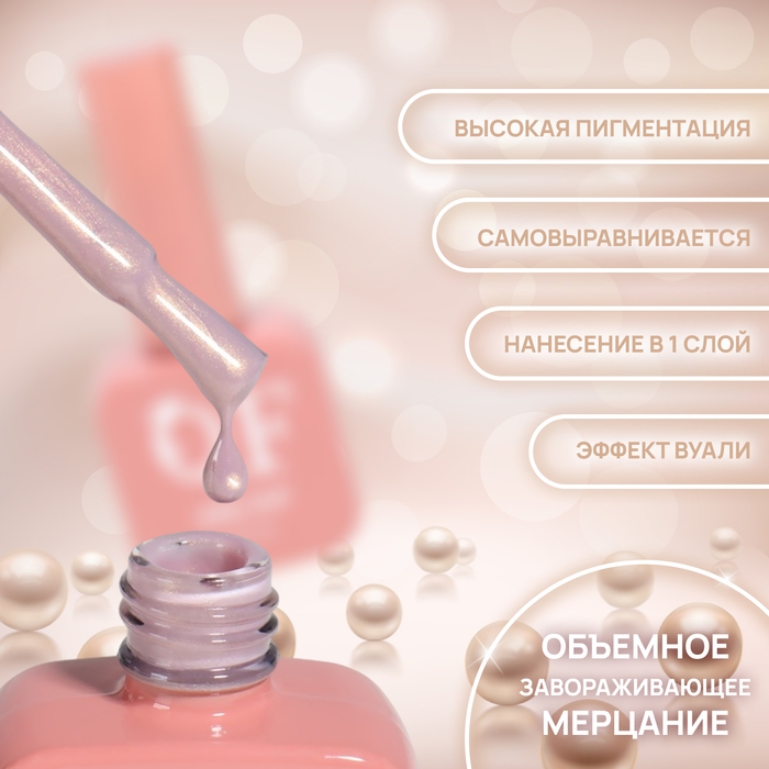 Деликатное сияние гель лака раскрывается при попадании на покрытие света. Перламутровый лак равномерно распределяется и идеально сцепляется с ногтевой пластиной. Используйте для праздничного и повседневного маникюра. Индикатор цвета на верху бутылька, поможет Вам подобрать идеальный цвет.