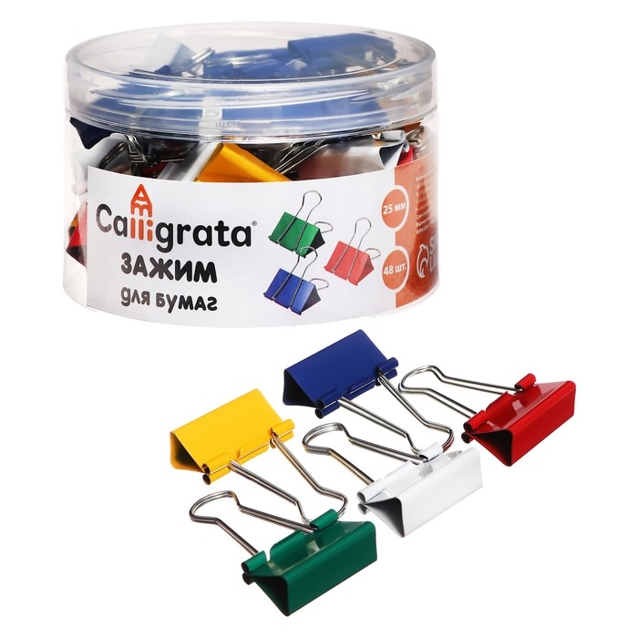 Набор зажимов для бумаг цветных 25мм, 48 штук, 4 цвета, в пластиковой тубе