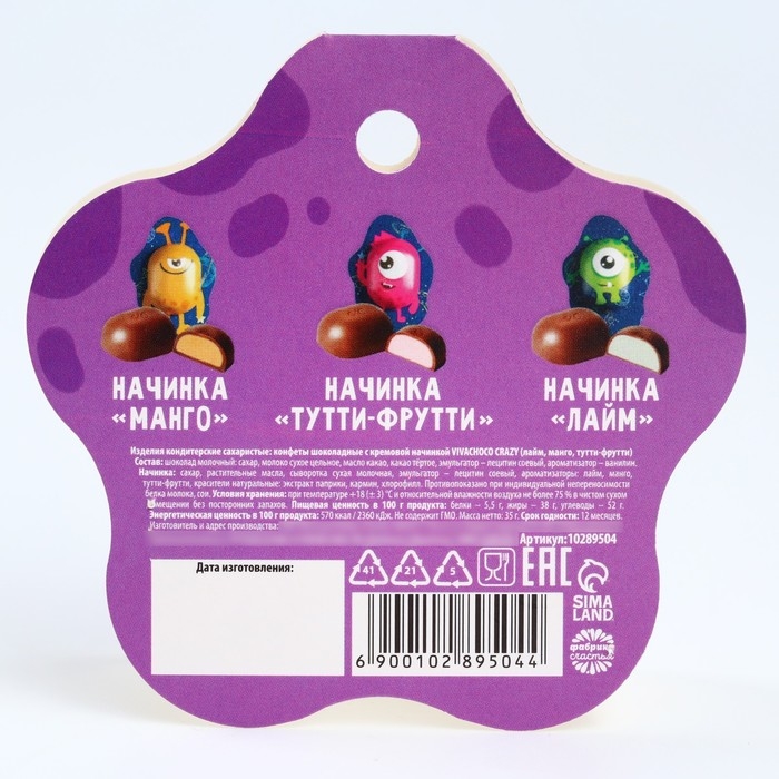 Состав: шоколад молочный: сахар, молоко сухое цельное, масло какао, какао тёртое, эмульгатор - лецитин соевый, ароматизатор - ванилин; начинка: сахар, растительные масла, сыворотка сухая молочная, эмульгатор - лецитин соевый, ароматизаторы - лайм, манго, тутти-фрутти, краситель натуральный - экстракт паприки.