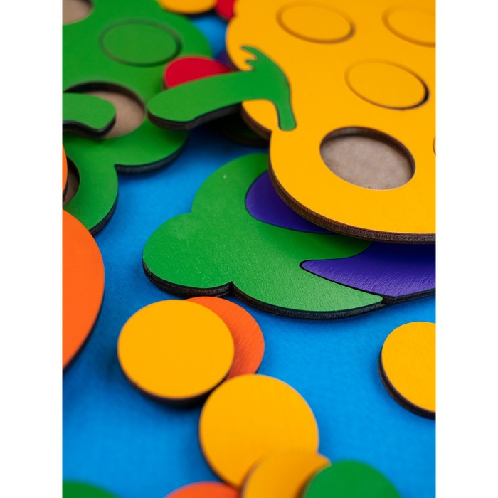 - Задача ребёнка — заполнить цветными кружками отверстия.