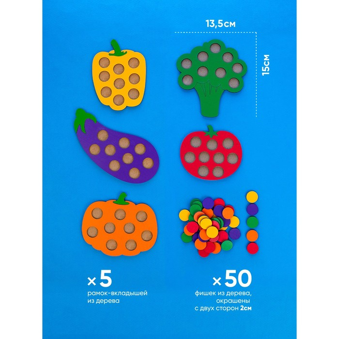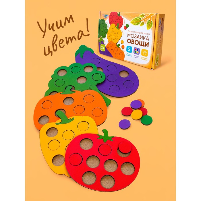 Мозаика «Овощи» — это яркие фигуры в виде брокколи, помидора, тыквы, перца и баклажана. Мозаика помогает изучить: формы, цвета и счет.