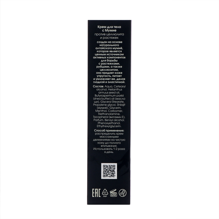 Крем для тела с Мумие создан на основе натурального алтайского мумиё, которое является ценным источником активных компонентов для борьбы с растяжками, рубцами, а также целлюлитом, оно придает коже упругость, питает и увлажняет ее, делая гладкой и эластичной.