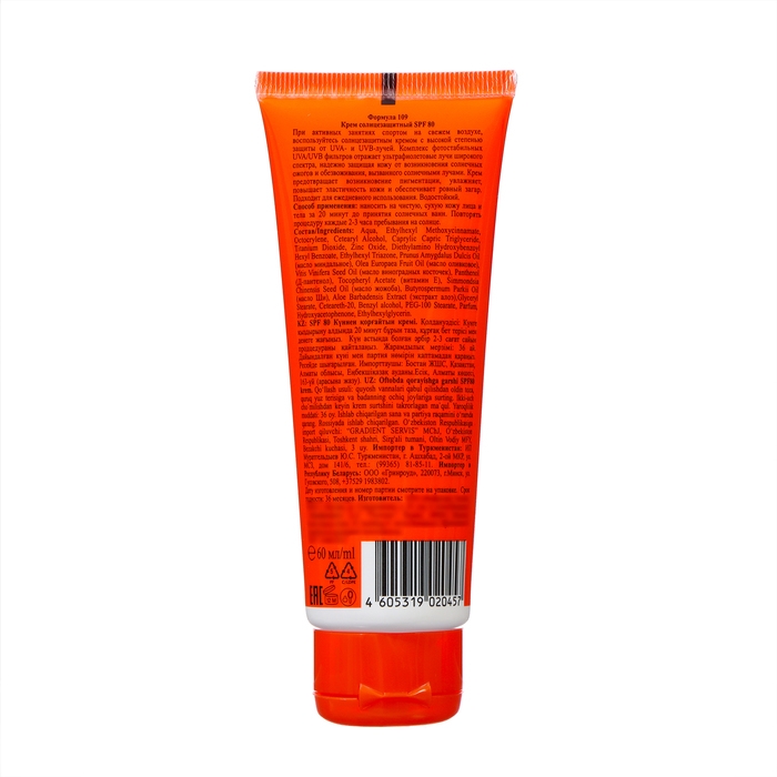Способ применения: наносить на чистую, сухую кожу лица и тела за 20 минут до принятия солнечных ванн. Повторять процедуру каждые 2-3 часа пребывания на солнце.
