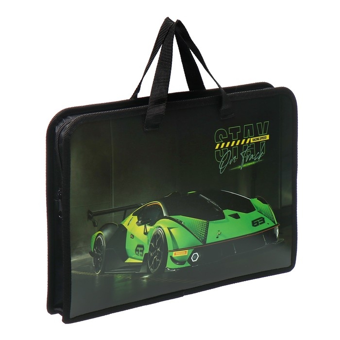 Папка с ручками А4, 340 х 245 х 45 мм, пластиковая, ручки-тесьма, Оникс ПТ-14 "Зелёное авто"