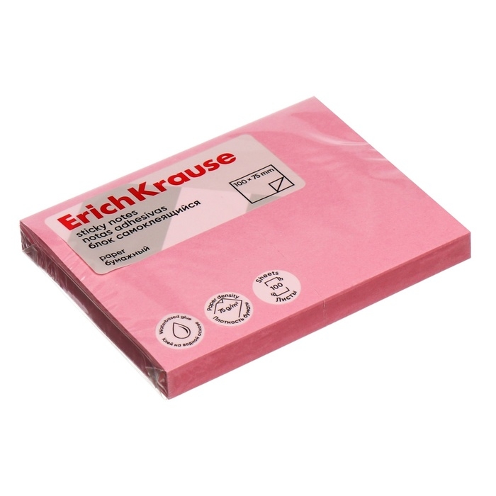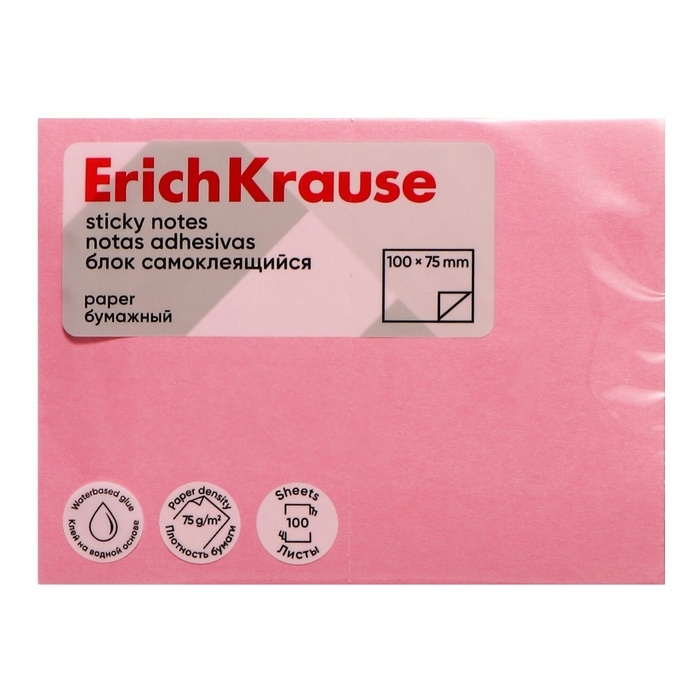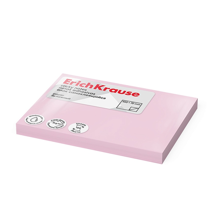Блок с липким краем бумажный 100х75 мм, ErichKrause, 100 листов, розовый