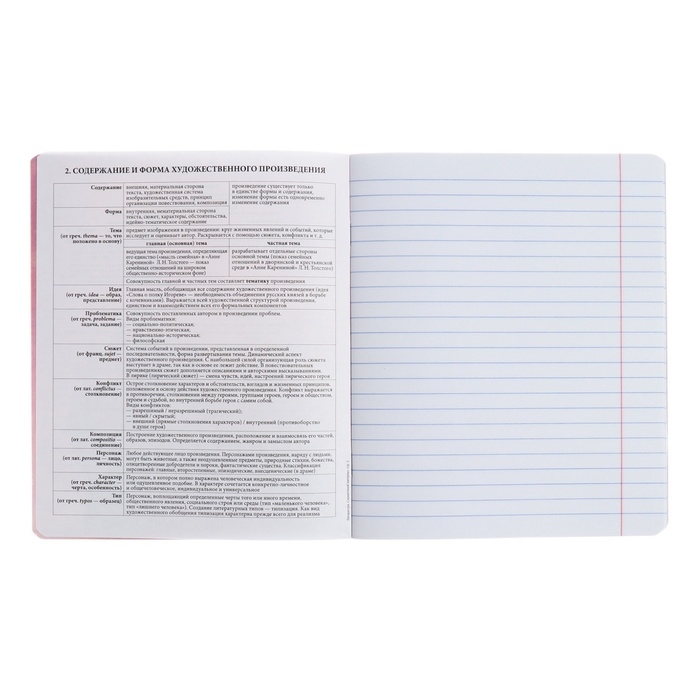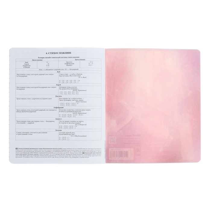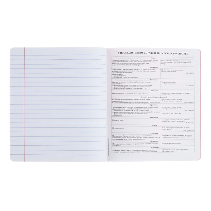 Тетрадь предметная формата А5+ (170х203 мм). Обложка из высококачественного мелованного картона плотностью 190 г/м2. Отделка - твин-лак. В блоке 48 листов в линейку с полями. Бумага офсетная плотностью 60 г/м2. Белизна бумаги - 100%. Цвет линовки - синий. Скругленные уголки обложки и блока. Тип скрепления - скоба. Имеет дополнительный лист с инфо-блоком с кратким изложением школьной программы. Тетради упакованы в термоусадочную плёнку по 5 штук.