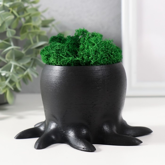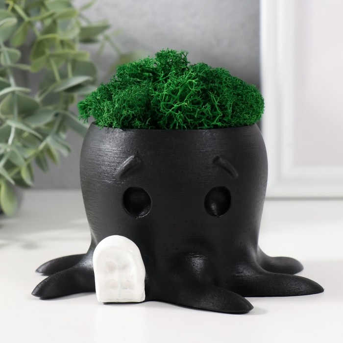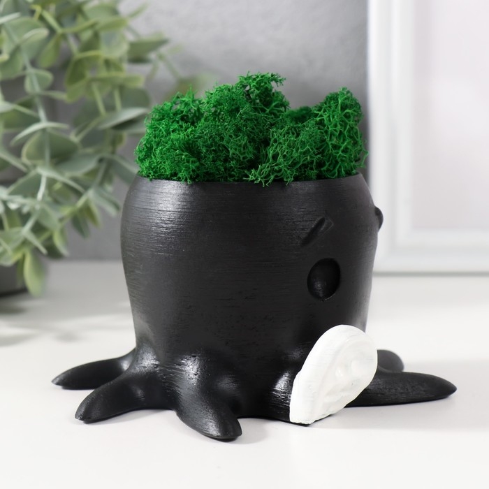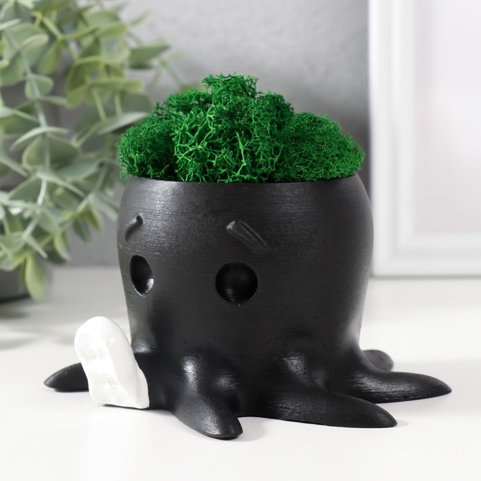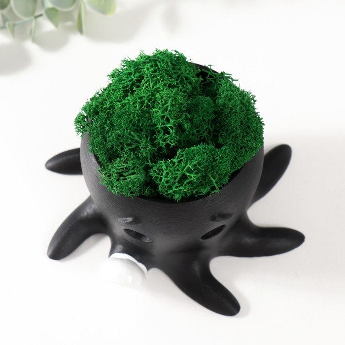 Кашпо бетонное "Осминог" высота 7 см, d-6,5 см черный с белой лапкой со мхом (мох зел,стаб)