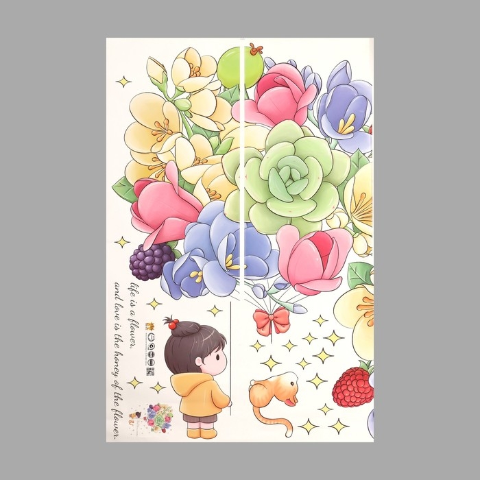 Наклейка пластик интерьерная цветная "Девочка с котиком и букетом" 2 листа 30х90 см