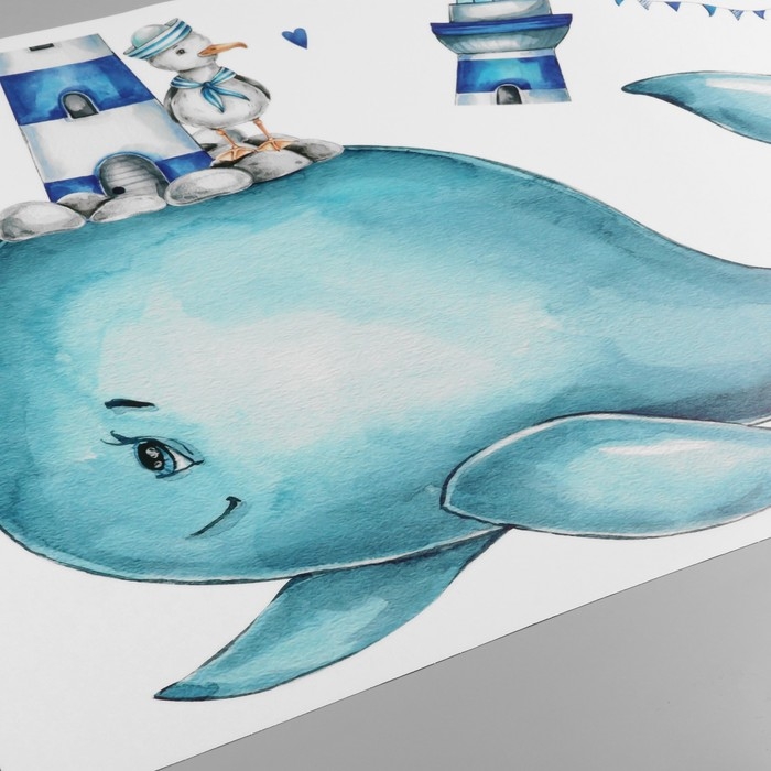 Наклейка пластик интерьерная цветная "Кит с маяком и чайкой" 40х60 см