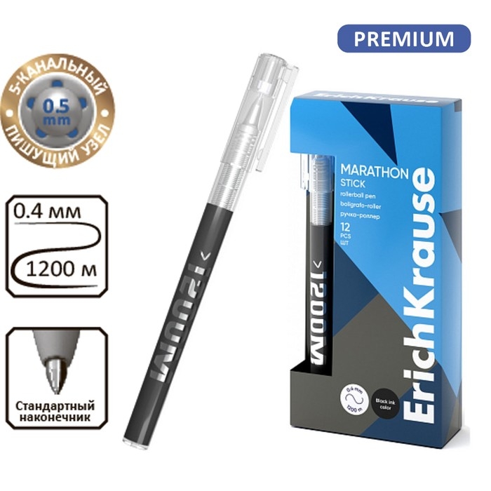 Ручка-роллер ErichKrause Marathon Stick, узел 0.5 мм, чернила чёрные, мягкое и тонкое письмо, длина линии письма 1200 метров