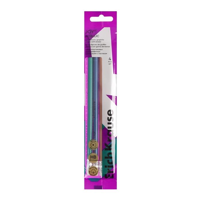 Набор чернографитных карандашей с ластиком 4 штуки ErichKrause "JOY Metallic", HB, грифель d=2.2 мм, пластик, круглых в пакете, металлик микс