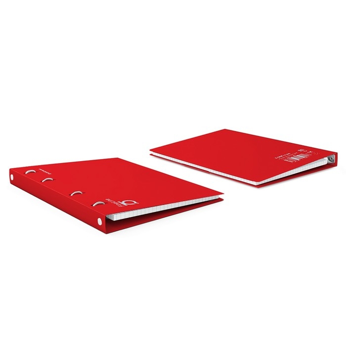 Тетрадь общая формата А5 (147x205 мм). Обложка из высококачественного износостойкого матового пластика с фактурой «песок». В блоке 100 листов в клетку в рамке. Бумага офсетная плотностью 80 г/м2. Цвет линовки — синий. Скругленные уголки обложки. Тип скрепления — кольца. Прорези под кольца оснащены фиксаторами, которые предотвращают раскрытие тетради.