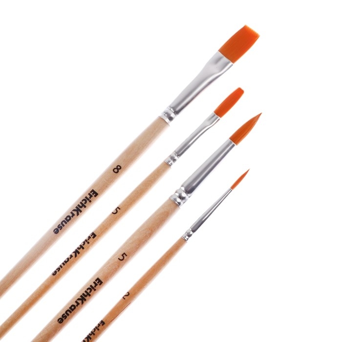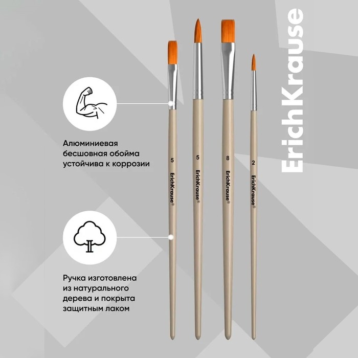 Кисти ErichKrause для рисования акварельными красками и гуашью изготовлены из синтетики. Хорошо впитывают и отдают краску, рабочая часть кисти покрыта гуммирующим составом, защищающим ее при хранении и транспортировке. Ручка изготовлена из натурального дерева и покрыта защитным лаком. Кисти разного размера позволяют рисовать как крупными, широкими мазками, так и прорабатывать мелкие детали рисунка. Цельнометаллическая бесшовная обойма из алюминия устойчива к коррозии. Круглые- 2, 5; Плоские- 5,8.