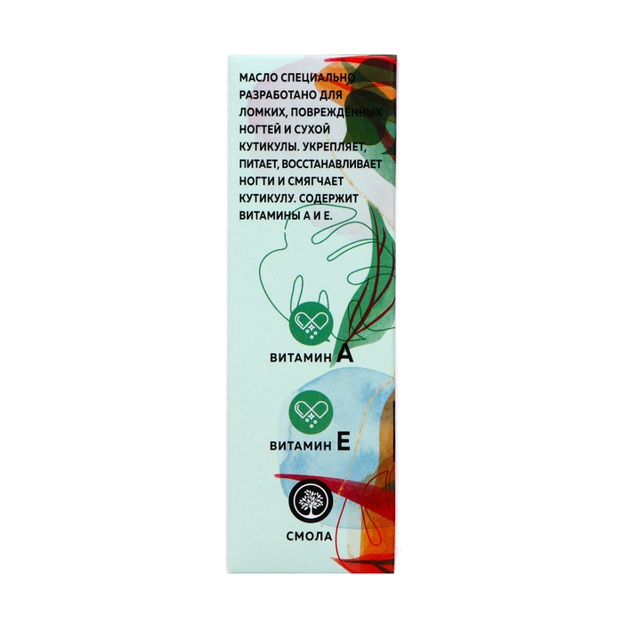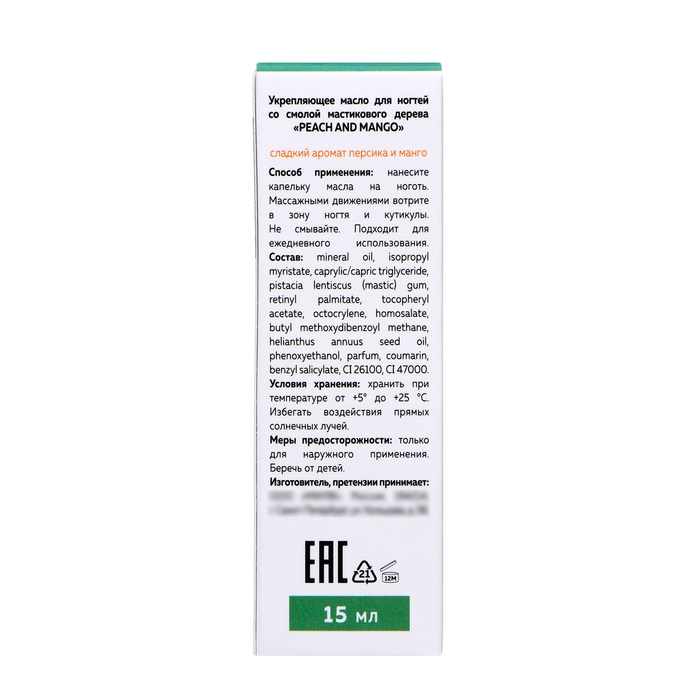 Быстро впитывается, оставляет приятное ощущение и сладкий аромат персика и манго. Содержит витамины А и Е. Смола мастикового дерева в составе масла увеличивает толщину ногтей и повышает их прочность при ежедневном использовании в течение 1 месяца. Рекомендовано для ломких, повреждённых ногтей и сухой кутикулы.