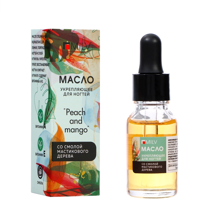 Масло для ногтей укрепляющее со смолой мастикового дерева MILV персик и манго, 15 мл