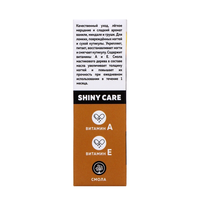 Качественный уход, лёгкое мерцание и сладкий аромат ванили, миндаля и груши. Для ломких, повреждённых ногтей и сухой кутикулы. Укрепляет, питает, восстанавливает ногти и смягчает кутикулу. Содержит витамины А и Е. Смола мастикового дерева в составе масла увеличивает толщину ногтей и повышает их прочность при ежедневном использовании в течение 1 месяца.