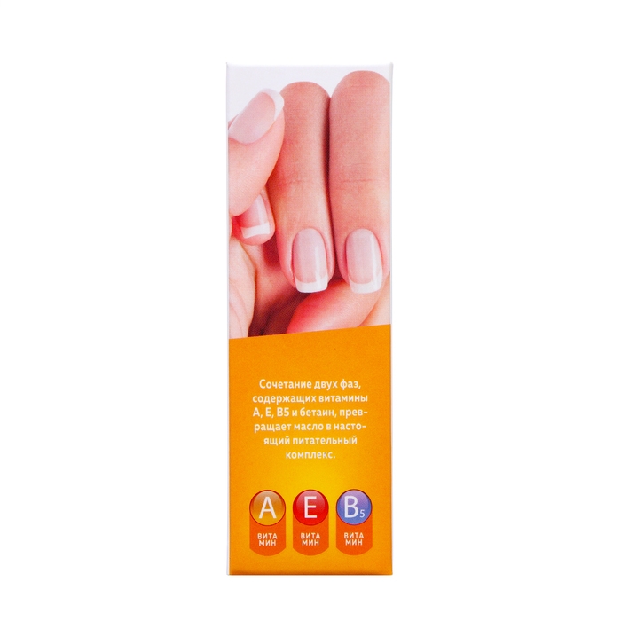 Благодаря сочетанию двух фаз масло отлично питает и увлажняет кожу вокруг ногтя, смягчает и восстанавливает кутикулу, предохраняет ногтевую пластину от пересыхания и возвращает ей здоровый вид. Первая фаза содержит витамины А и Е, вторая фаза содержит витамин В5 и бетаин. При регулярном применении сохраняет естественную красоту ногтей.