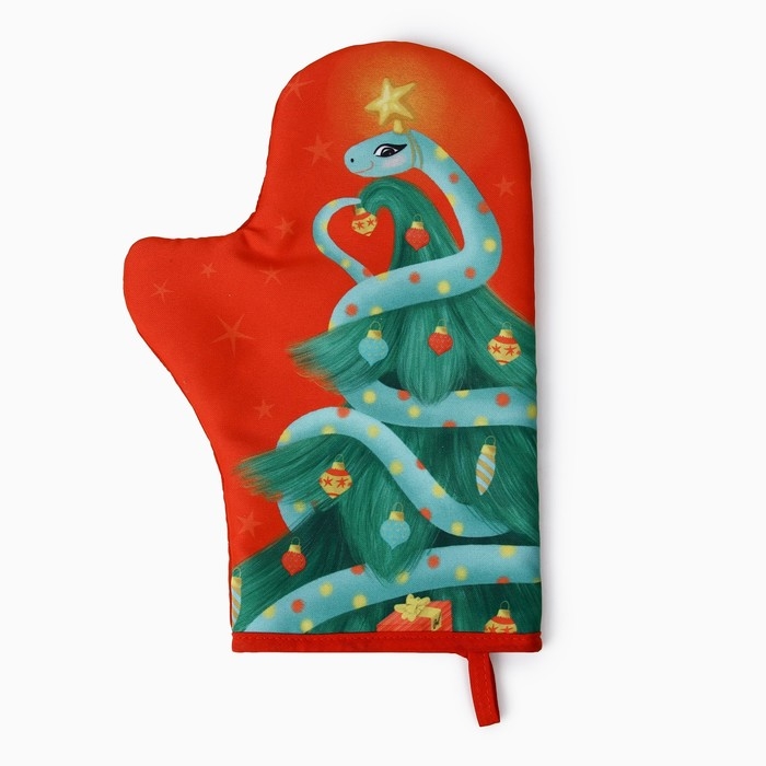 Новый год. Символ года 2025. Змея. Варежка-прихватка Доляна "Новогодний подарок" 20х28 см, 35% хл, 65% пэ, ватин 250 г/м2