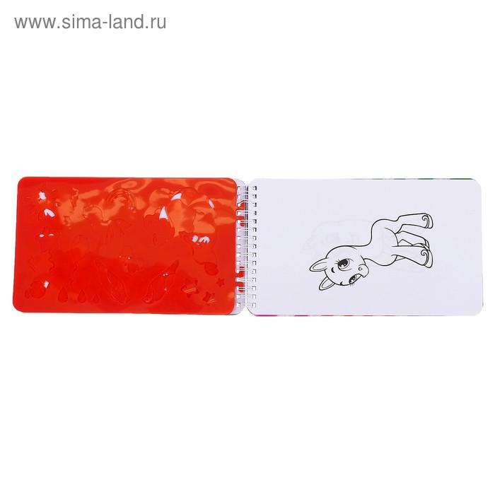 В альбоме есть 5 листов с пластиковыми трафаретами, которые можно снимать и в дальнейшем использовать для создания поделок. Также внутри есть 2 листа наклеек, инструкция, 36 страниц с шаблонами картинок, которые ребёнок должен дорисовать, и 36 чистых страниц для свободного творчества. Малыш сможет проявить фантазию и украсить рисунки наклейками.