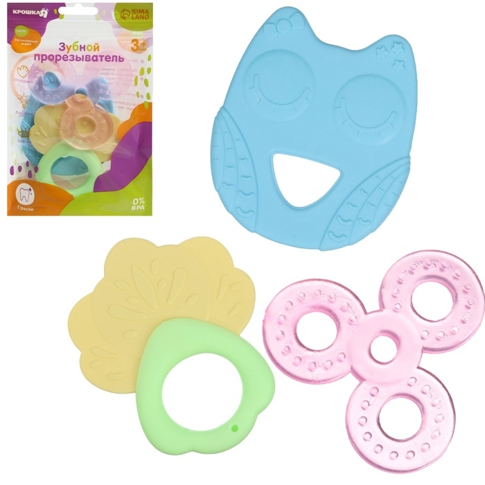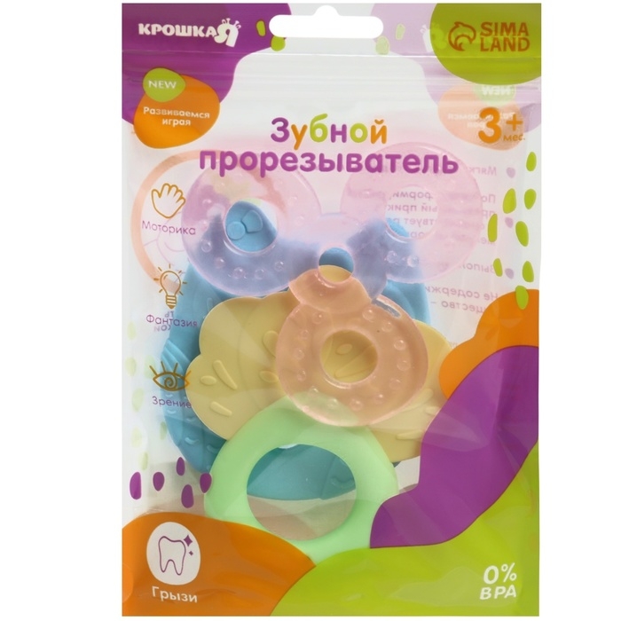 Прорезыватель снимает неприятные ощущения у малыша в период появления первых зубов. Также изделие подготовит ребёнка к процессу жевания, поспособствует формированию правильного прикуса и развитию мелкой моторики рук. Погремушка в наборе способствует развитию воображения, познанию мира звуков, цветов и визуальному восприятию.