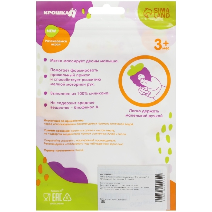 Товар изготовлен из прочного и безопасного силикона, не содержащего бисфенола А. Рекомендовано для детей от 3 месяцев.